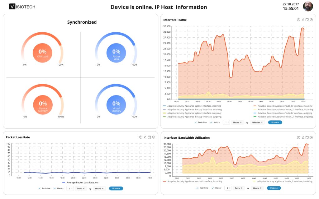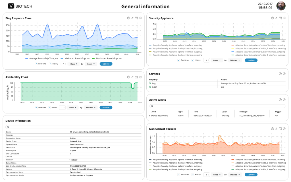 For SNMP-enabled devices, the platform offers deeper insights, including interface-level network traffic analytics, ping round-trip time tracking, and detection of packet loss and connection quality issues.