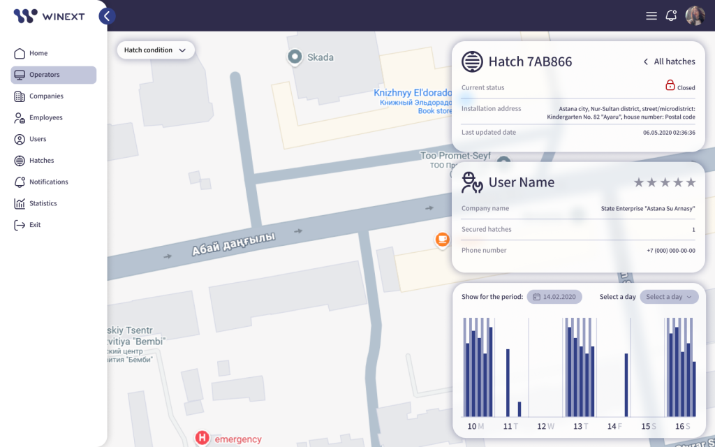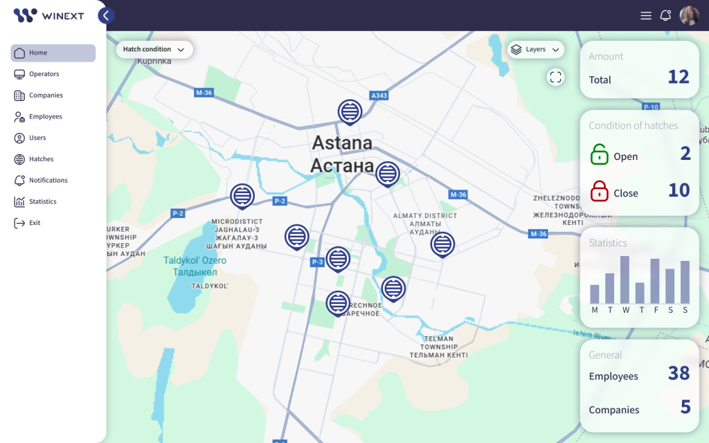 The city utilities of Nur-Sultan required an automated monitoring system to manage manhole maintenance, prevent unauthorized access, and ensure public safety. Winext developed a solution built on the Iotellect IoT Platform that provides real-time equipment monitoring while preventing cover theft and unauthorized openings. This system of advanced sensors and a central cloud platform enables proactive supervision, accurate planning, and efficient management of the city’s manhole infrastructure.